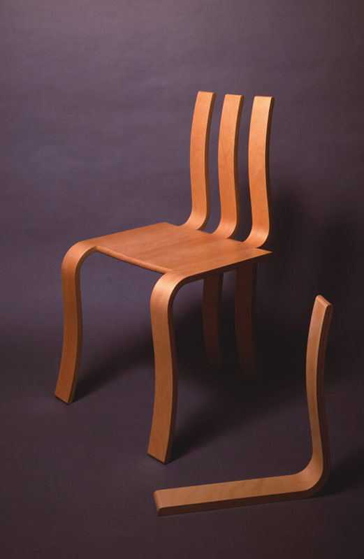 単一のL型ユニットを繰り返し使い、イスやテーブルを構成するシステムである。単一部材を使い、しかも収納がフラットになるため、在庫収納やや輸送が楽になり、コストダウンも図れる。初期案は曲げ合板によるが、最終的には家具屋の廃材から寸法を決めた無垢の木に、軽量化とジョイント用に穴を開けた部材としている。