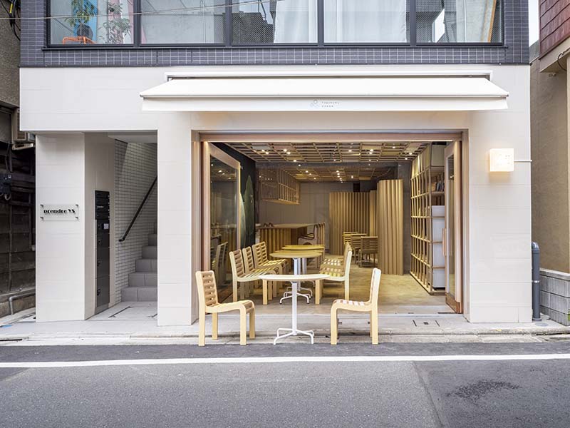 A grid was found to accommodate storage, display shelves, lighting, and air conditioning for the cafe's needs, and the entire space is covered with paper tubes.