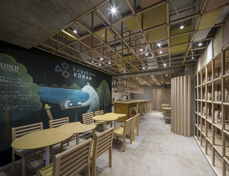 カフェに必要な収納や飾り棚、照明、空調などを納められるようなグリッドを探し出し、紙管を使った立体格子で全体を覆っている。立体格子を作る紙管の温かみに加え、カラフルな吸音板を立体格子にはめ込むことで明るい雰囲気を作り出し、テナントスペースの中に全体性を持ったインテリアデザインを行っている。