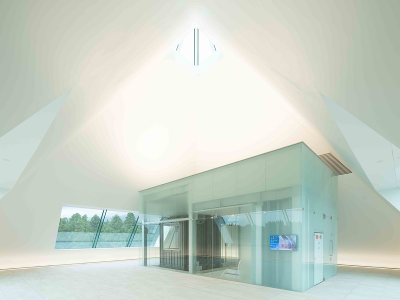 The request was to design a symbolic factory to commemorate the company's 100th anniversary, located on a site next to the Second Tomei Expressway, which is currently under construction. The design was required to be visible from highway vehicles, to represent a factory producing high-tech glass for dental materials, and to have a viewing space with Mount Fuji at the top. Due to the glass manufacturing process, the floor area of the lower floors was large, while the viewing space was small, and the pyramidal shape was chosen to contrast with the view of Mount Fuji. Since the plant will generate electricity to cover almost all of the electricity used in the plant, it was confirmed that a pyramidal shape would also enable it to generate electricity on the north side, and so the entire surface could be covered with solar panels.